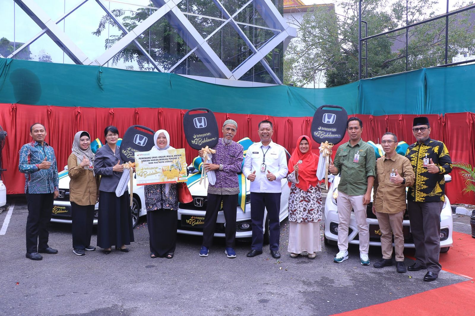 PEKANBARU - Penjabat (Pj) Sekretaris Daerah Kota (Sekdako) Pekanbaru Indra Pomi Nasution menyerahkan tiga hadiah mobil Honda Brio hasil undian Bank Riau Kepri (BRK) Syariah, Rabu (11/1/2023). BRK Syariah juga memberikan hadian undian berupa kepingan emas Antam bagi 30 nasabah di Pekanbaru.