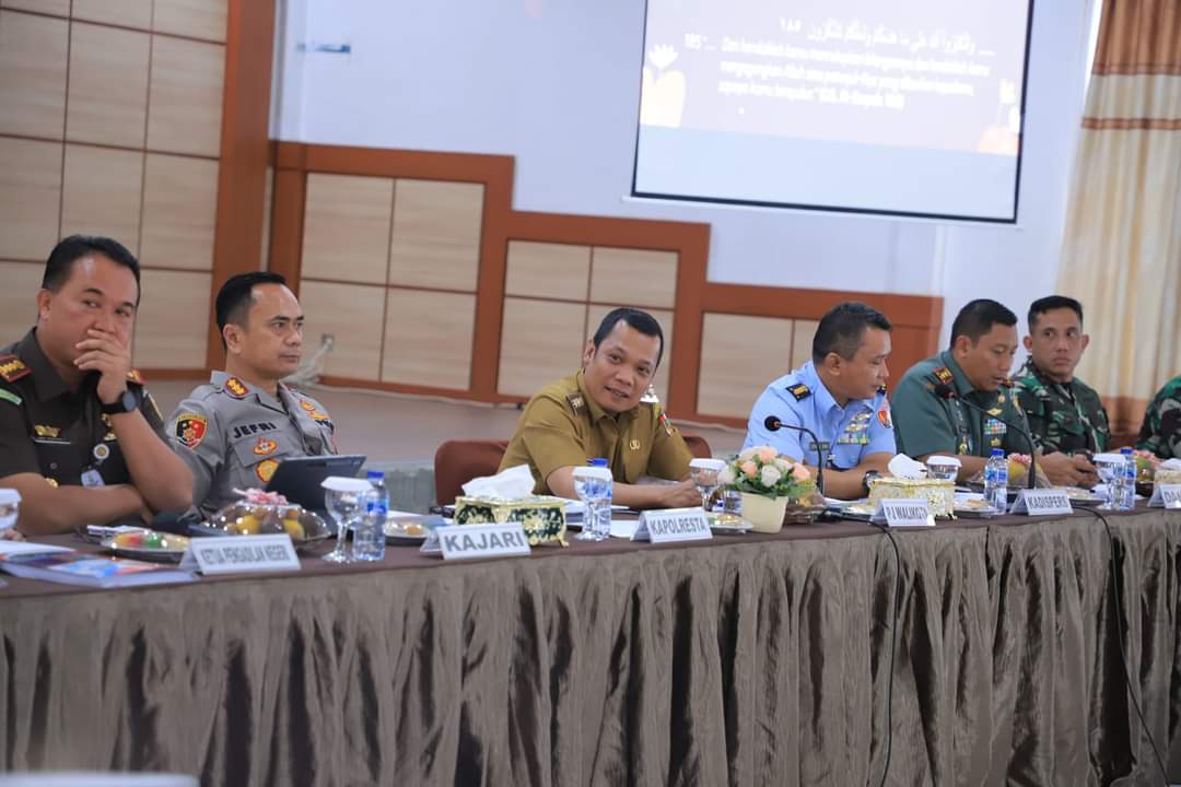 PEKANBARU - Penjabat (Pj) Wali Kota Pekanbaru Muflihun SSTP MAP memimpin rapat Forum Koordinasi Pimpinan Daerah (Forkopimda) di Balai Prajurit Edi Harjoko Lanud Roesmin Nurjadin, Jalan Inpres, Senin (12/6/2023).