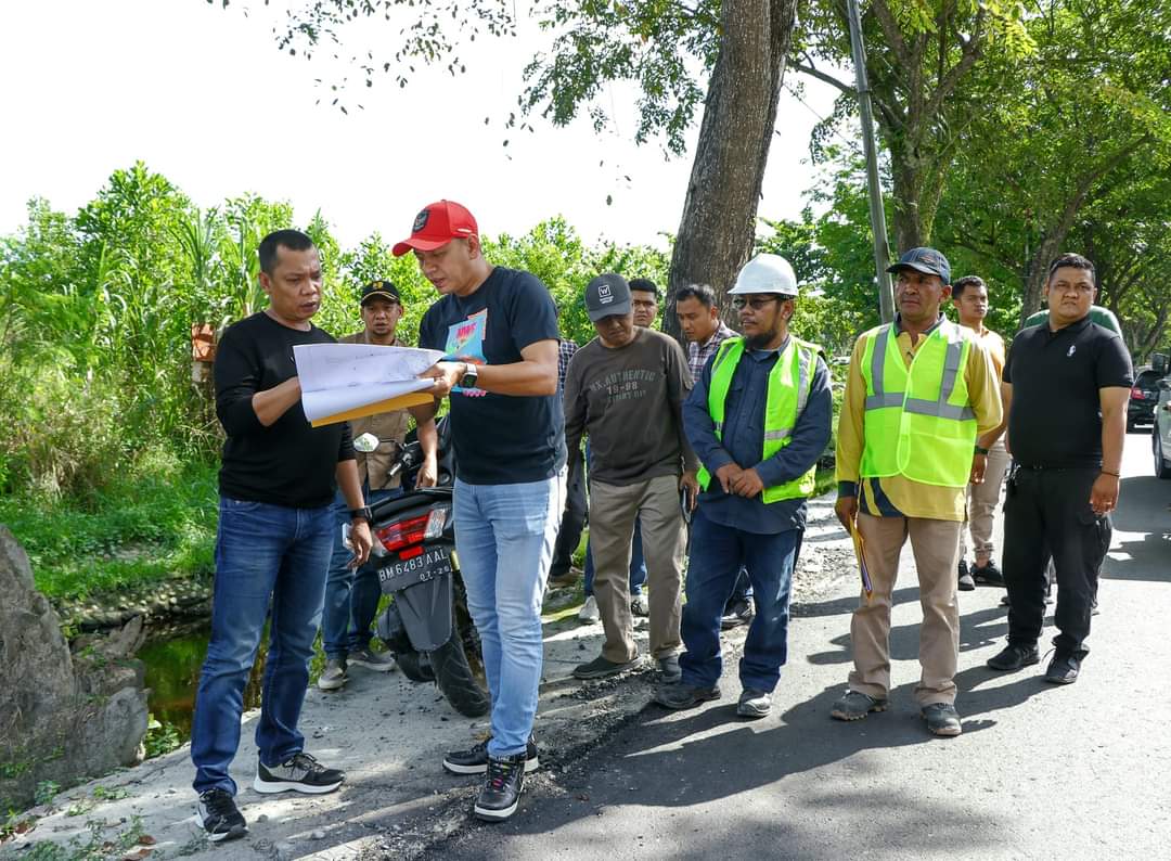 PEKANBARU - Penjabat (Pj) Wali Kota Pekanbaru Muflihun SSTP MAP didampingi Plt Kepala Dinas PUPR Edwariansyah meninjau keadaan Jalan Parit Indah, Kota Pekanbaru.